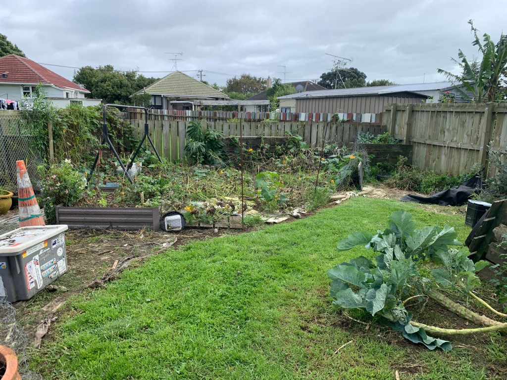 Jackie is a worthy recipient if we look at the ‘hand up’ rather than ‘hand out’ concept. You’ll see her vege garden in the back corner which is kamokamo and pumpkin self seeded along with tomatoes, silverbeet etc. She explained she cleared the whole back yard of bamboo along with the help of Kainga Ora, and did a garden course with someone just before lock down where they got the square bed in the LHS of first pic, along with soil and seeds and this started her off. She now has lettuces and seedlings of anything she can get her hands on, growing in any pots or tubs she finds. She had lettuce growing in polystyrene tubs and it was doing so well she had been bagging it up and putting it on grapevine for people to come and get, and offered me some.